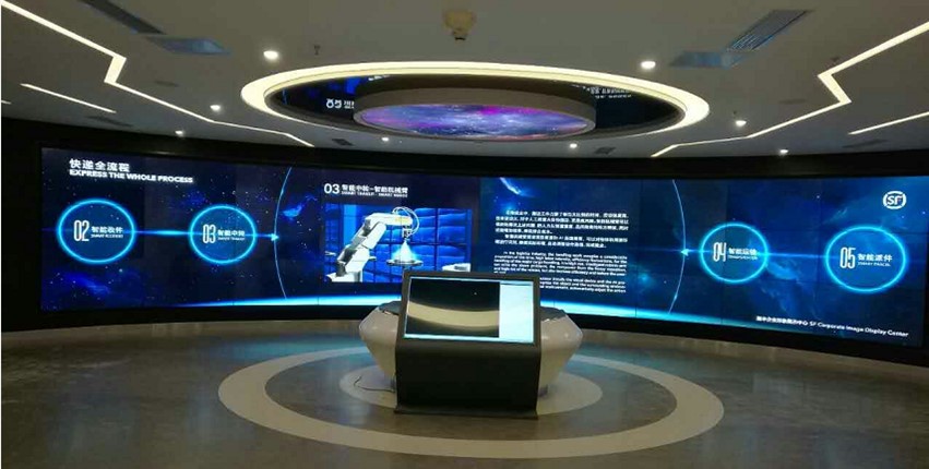 受限于现场安装环境,无法在一个平面呈现,采用55寸通天地支架,可以按照现场环境调整支架高度,同时1.8mm小拼缝屏幕更利于在曲面上做拼接展示。
